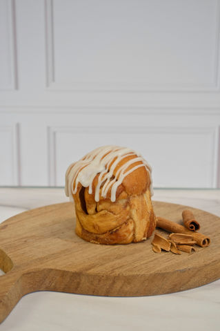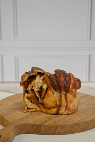 Versión mini del Babka, pan tradicional en Pascua y de la religión Judía. Masa brioche trenzada rellena con crema de avellanas. Textura suave y esponjosa.